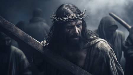 Jesus Christ carries his cross to Golgotha. Bible. Faith. Torment and suffering. Giving his life for our sins. The hard way. Christian symbol of faith. Calvary. God. Generative AI