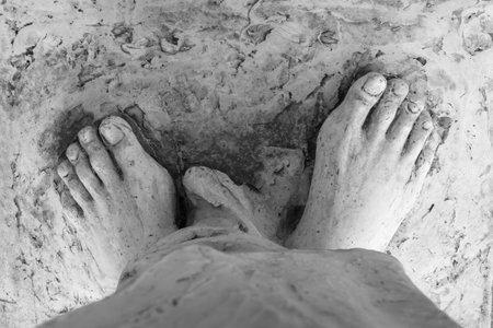 Extreme close-up of the feet of Jesus Christ. Top view. Shallow depth of field.