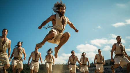 In spirited competition ancient athletes defy gravity their leaps a dance of ambition