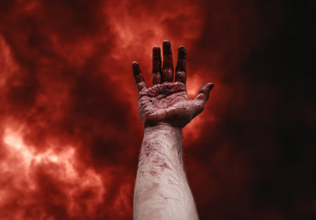 Halloween zombie hands on grey sky background. Bloody hands with red blood stretching up. Maniac or murderer concept. Halloween holiday celebration