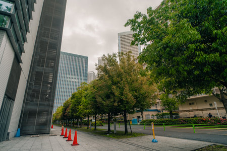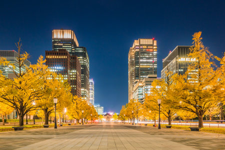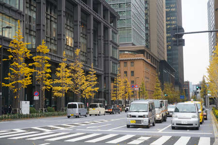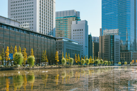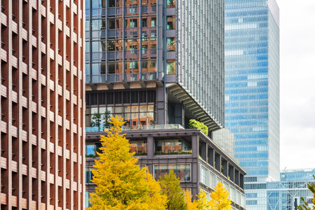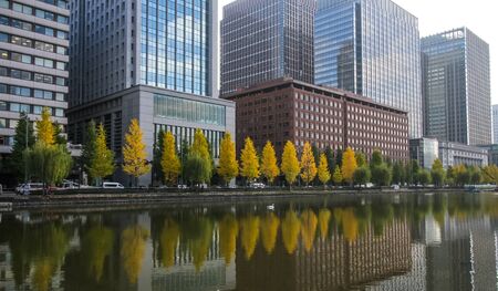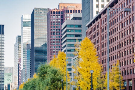 Buildings in Tokyo with autumn leaves. Golden leaves foliage gingko Maidenhair trees in front of high-rise corporate office buildings in late Autumn in Tokyo Japan