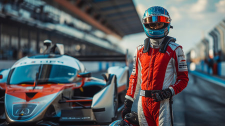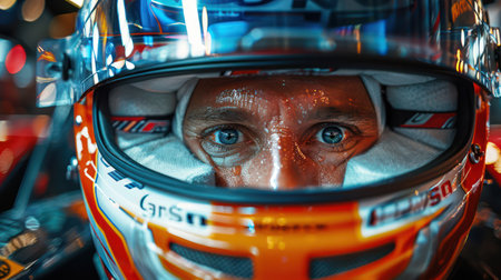 A close-up portrait of a race car driver wearing a helmet, ready for a high-speed race, exuding determination and focus. High quality photo