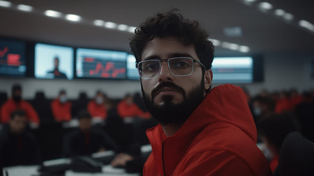 A man with a beard and glasses is wearing a red hoodie and looking intently at something. There are screens in the background.