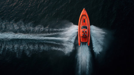 An overhead view shows an orange speedboat cutting through dark ocean waters, producing significant white wake. The composition highlights the boat's design and speed against a contrast of light and shadow. Ideal for commercial applications related to maritime activities, transportation, and travel themes.
