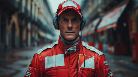 A Race Car Driver Standing In A Street, Wearing A Red Suit And Headphones