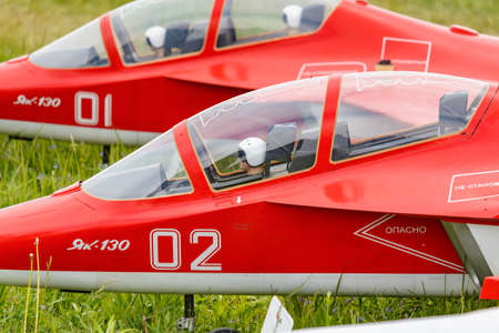 Balashikha, Moscow region, Russia - May 25, 2019: Pilots cabin of big scale RC model with jet engine of combat-training aircraft Yak-130 of RusJet team closeup at festival Sky Theory and Practice 2019