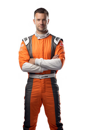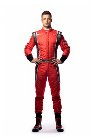 Young racer in white and red uniform, standing with helmet in hand, prepared for the intense speed and competition
