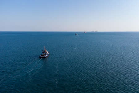 The sea tug moves from the port water area towards the open sea. Photo from the helicopter. View from above