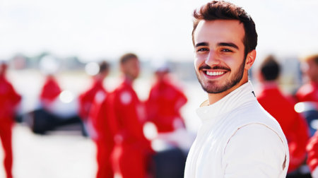 Smiling Race Car Driver with Team in Red Uniforms on Track.