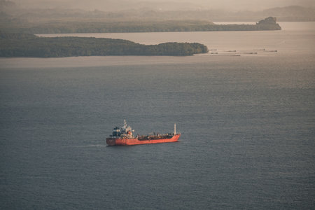 Large red oil tanker anchored near lush tropical coastline in Brazil, surrounded by deep blue ocean and distant cargo ships under bright sunlight, concept of global trade and maritime transport