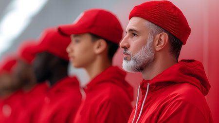 A male football coach, with a close-up profile, inspires focus among his red-uniformed team members.
