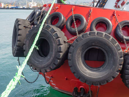 Protection of the side of the ship with car tires. Moored ship. Portholes in the hold. Ship at the pier. Equipment in the port. board of the ship