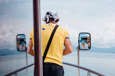 Surat Thai, Thailand - January 24, 2018: Tourists traveling on a ferry to the Koh Samui and Koh Phangan islands. Man standing on the deck