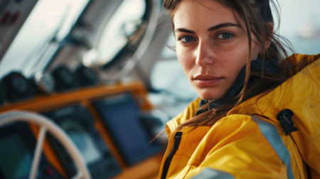 Young woman in a bright yellow raincoat on a boat, looking intently at the camera with a focus on her expression