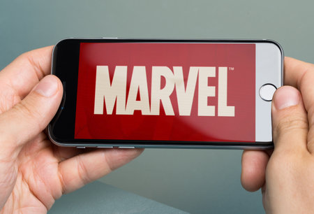 Berlin; Germany - October 10; 2014: Cropped image of hands holding Apple iPhone 6 with logo of brand Marvel. Apple iPhone6 was launched on September 19; 2014