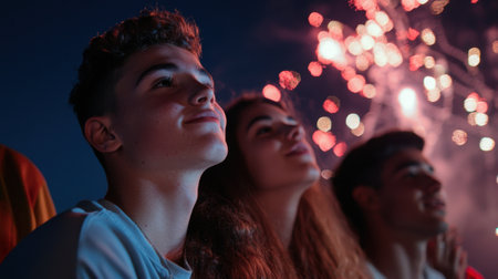 A group of friends watch in awe as colorful fireworks burst in the night sky. Their expressions show joy and wonder, capturing the festive atmosphere of the summer celebration.