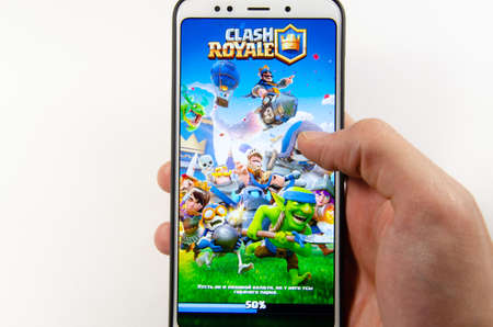 April, 2019. Kramatorsk, Ukraine. Clash Royale gameplay on a white smartphone in hand