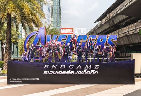 Bangkok, Thailand - Apr 25, 2019: Avengers Endgame movie backdrop display on street. Cinema theatre promotional advertisement, or film industry marketing concept