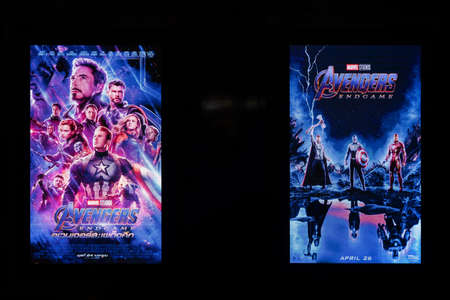 Bangkok, Thailand - Apr 28, 2019: Avengers Endgame movie advertisement on two LED screens. Cinema theatre promotional advertisement, or film industry marketing concept