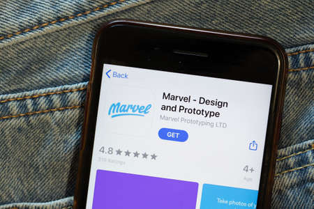 New York, USA - 15 May 2020: Marvel Design and Prototype mobile app logo on phone screen, close-up icon, Illustrative Editorial.