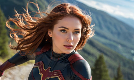 A red-haired superhero woman in a black suit stands heroically in a scenic landscape, her hair blowing in the wind. The natural beauty of the mountains adds to her strong and confident presence.