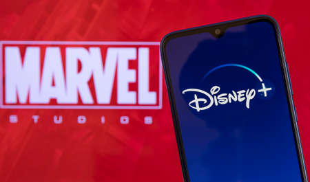 Disney plus logo on smartphone with Marvel logo on TV screen, 15th Jul, 2021, Sao Paulo, Brazil