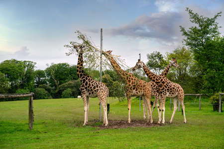 Six large giraffes, Giraffa Camelopardalis spp, grazing in their habitat in Dublin zoo, Ireland