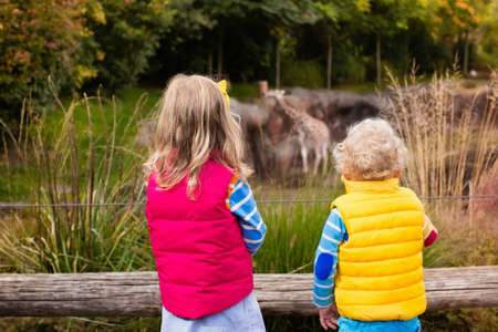 Two little kids, boy and girl, watch monkey show in the zoo on a cold autumn day. Children watching animals in safari park.
