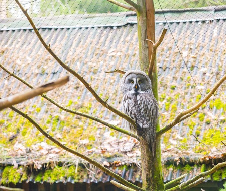 Front view from the great gray owl or great gray owl. A very large owl, Strix nebulosa