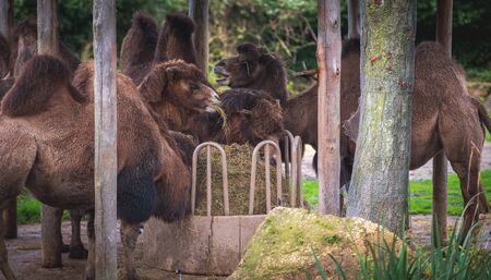 camels eat a mountain of hay under a roof at the zoo in blijdorp rotterdam netherlands