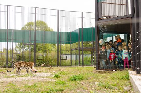 Komsomolsk-on-Amur, RUSSIA - SEPTEMBER 2, 2019. many people watch a leopard eat a chicken cake