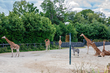 Giraffes and zebras in a wildlife park, zoo safari on sunny summer day. Activity for families with children.