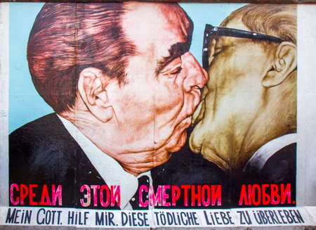 Graffiti painting on the Berlin Wall depicting Soviet leader Leonid Brezhnev kissing East German leader Erich Honecker