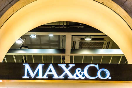 ROME, ITALY - JANUARY 3, 2019: lights are enlightening MAX AND CO logo on storefront at night