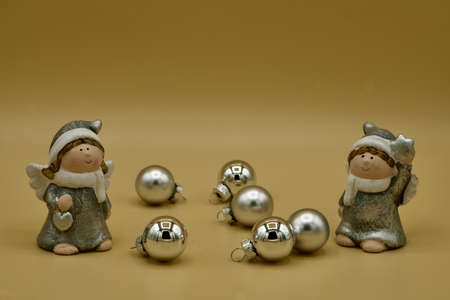 Christmas angels with Christmas baubles with a beige background