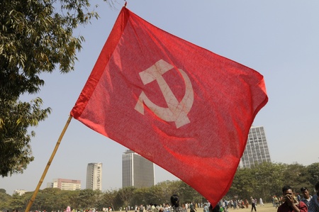 KOLKATA- FEBRUARY 13: The communist symbol of hammer & sickle flying during a political rally in Kolkata, India on February 13, 2011.