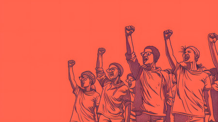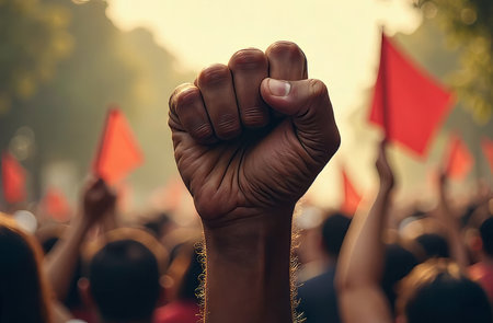 A diverse group of people gather at sunset, raising their fists and red flags in unity. Their expressions show determination, as they stand together advocating for social and political change..