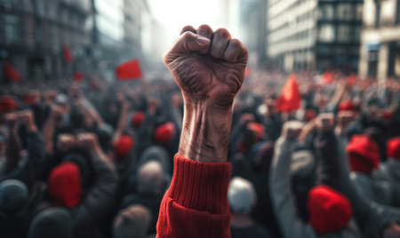 A raised red fist in front of a crowd with a red flag, a powerful concept of protest, revolution, employee strikes, or a strong social movement.
