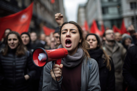 A protestor at a political demonstration talking into a loudpeaker megaphone