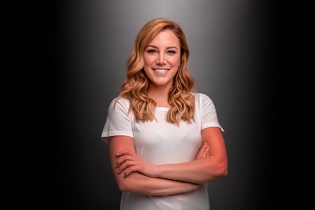 Attractive young woman in a T-shirt on a dark background.