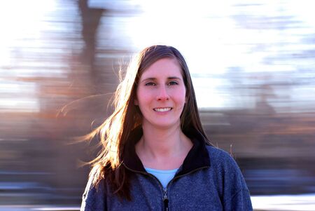 A young woman with long, wavy hair smiling in a sunlit outdoor setting with autumn foliage in the background