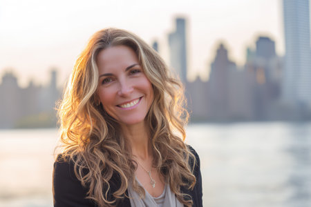 A woman stands by the water, smiling as sunlight reflects on the surface. The city skyline is visible in the background. This scene takes place during sunset.