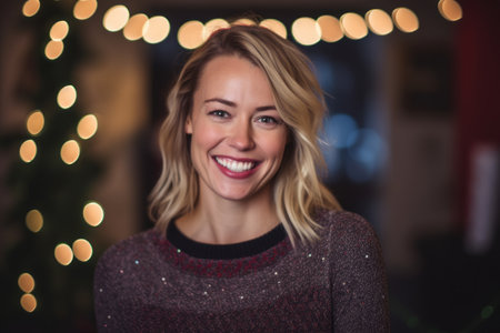 Portrait of beautiful woman smiling at camera in front of christmas tree