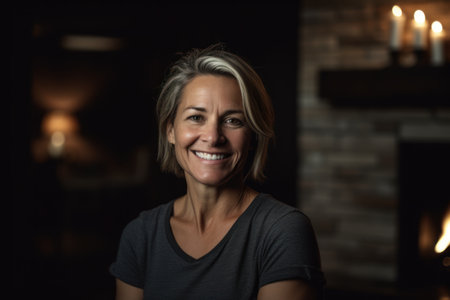 Portrait of a smiling woman in front of a fireplace at home