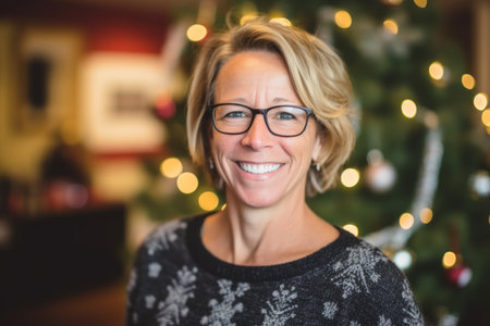 Portrait of smiling woman with glasses against christmas tree at home
