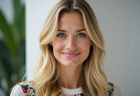 A blonde Swedish woman radiates joy with her engaging smile. Her captivating eyes and relaxed pose create a welcoming atmosphere, highlighting her natural beauty and charm indoors.