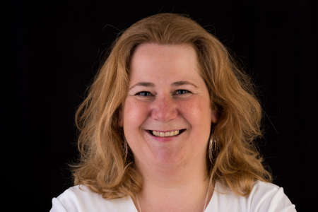 Portrait of a attractive european light overweighted red haired female in white shirt, headshot in front of black backgrouind