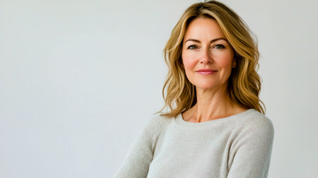 Beautiful woman aged 40-45, wearing a basic jumper and showing the waist part of her jeans.