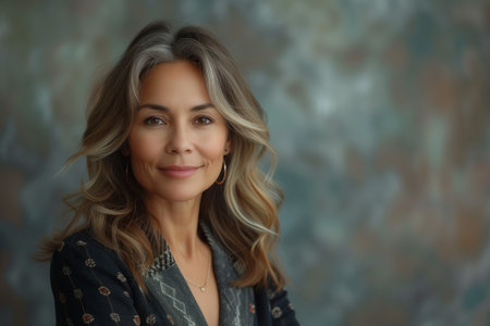 Portrait of a graceful mature woman with striking grey hair and a contemplative expression