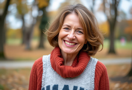 Portrait of a beautiful middle-aged woman smiling in the autumn park